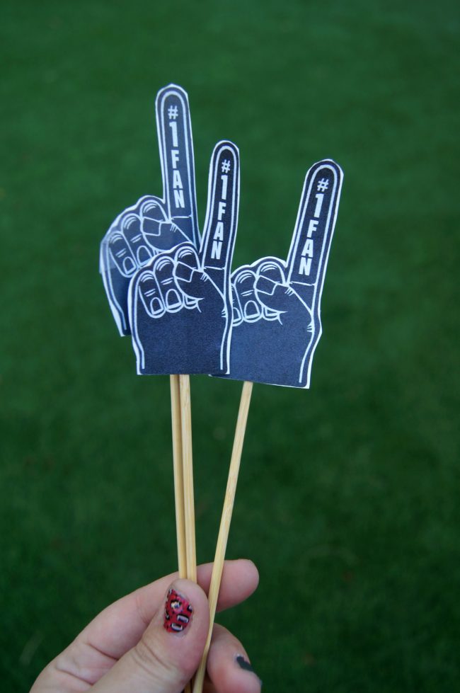 2. If you really want to add some unique decorations but don’t want to break the bank, consider purchasing some printables on Etsy or finding free ones on Pinterest. We made these little Foam Finger substitutes by printing out a photo of a finger online and taping them to some {not sharp} kabob sticks we had!
